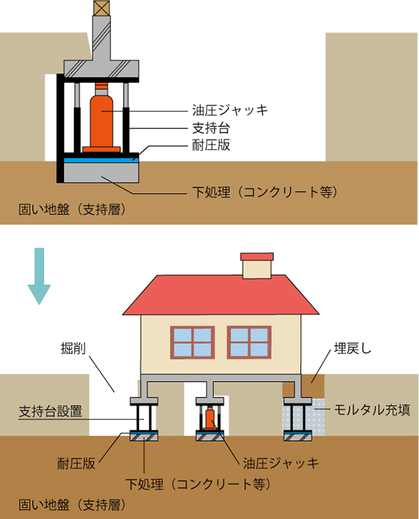 基礎下に耐圧版を配置し、家屋の沈下修正を行う工法です。