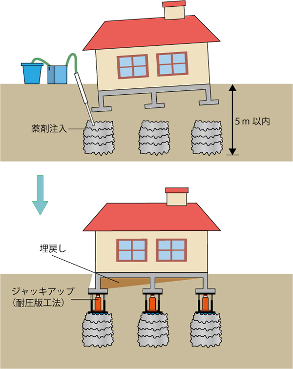 老朽化や地盤の液状化などで傾いてしまった建物の傾きを修正するのが沈下修正工事です。傾きの放置は、建物や周辺設備の破損、また住人の体調不良の原因となることも考えられます。