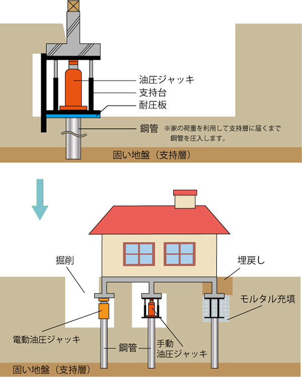 支持層から直接鋼管で支える工法です。